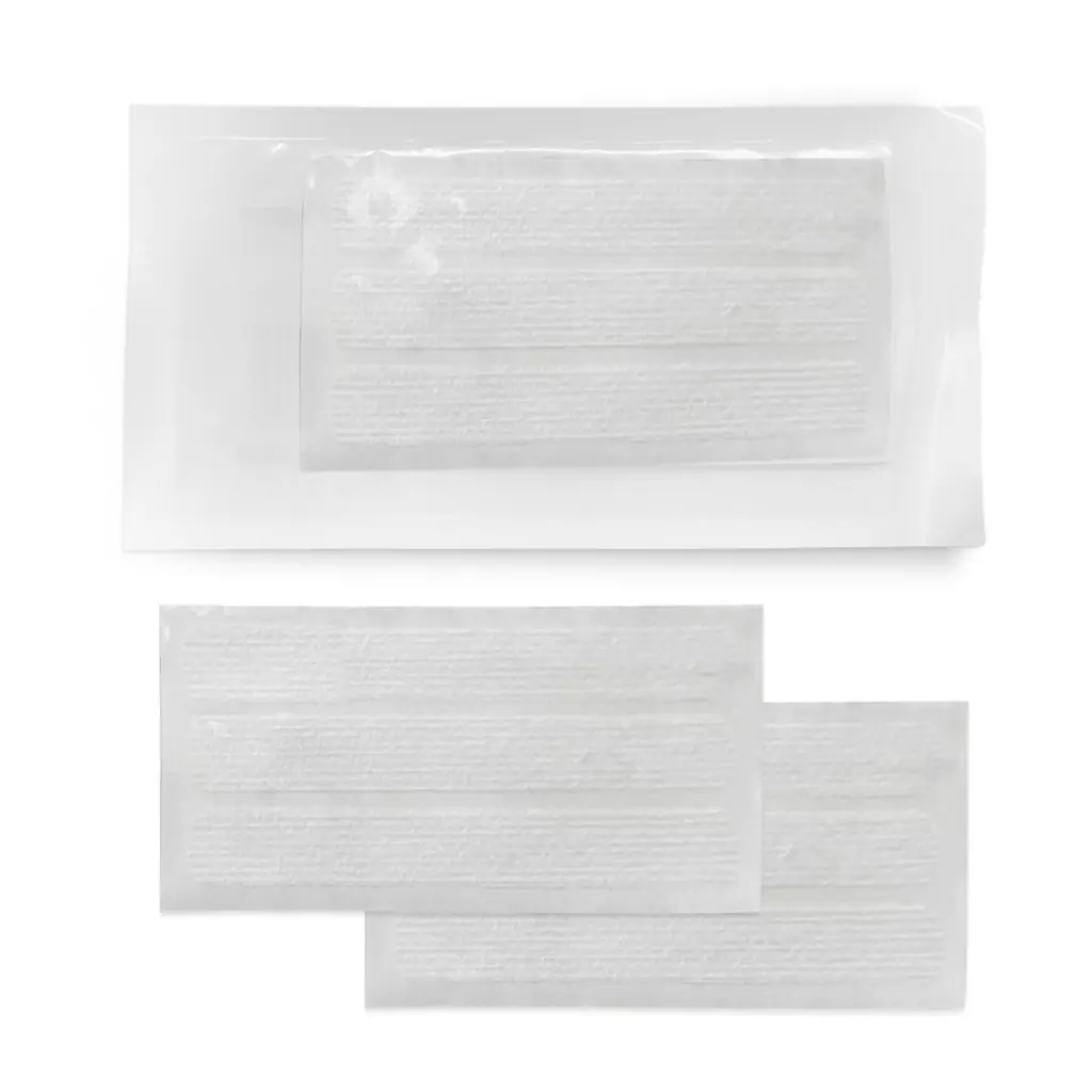 4. Ao usar a tira para suturar a pele, sem pontos ou grampos, juntar as bordas da pele com os dedos ou pinças. Colocar as tiras de um lado ao outro do ferimento, de forma a assegurar uma aplicação sem tensão.